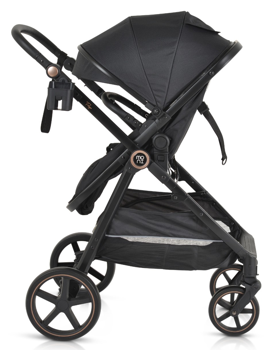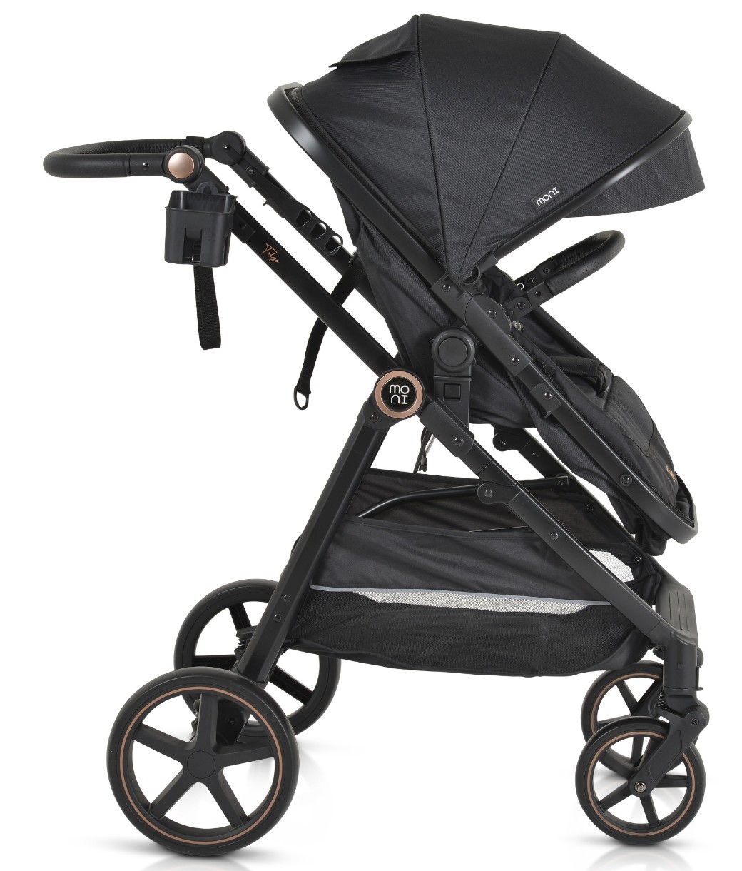 Spătarul scaunului este reglabil; 3 pozitii de scaun. Bara de protecție detașabilă din piele ecologică de înaltă calitate. Centuri de siguranță în 5 puncte cu pernițe moi pentru umeri. Baldachin mare reglabil cu o fereastră pentru vizualizarea copilului.
