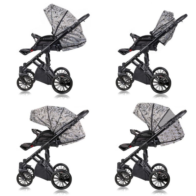 Suportul pentru picioare are mai multe poziții, spatele este de asemenea reglabil. Cadrul caruciorului este realizat din profil de aluminiu. Amortizoarele sunt instalate pe cadrul căruciorului. În plus, înălțimea mânerului poate fi reglată, astfel încât mersurile în comun să fie și mai plăcute. Mânerul este tăiat cu piele ecologică.