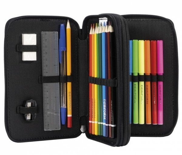 Echipamentul său include: 9 creioane creion, două creioane, un ascuțitor, o radieră, 18 markere, o riglă și două pixuri.