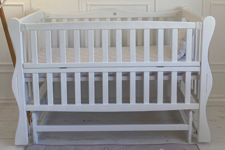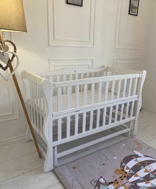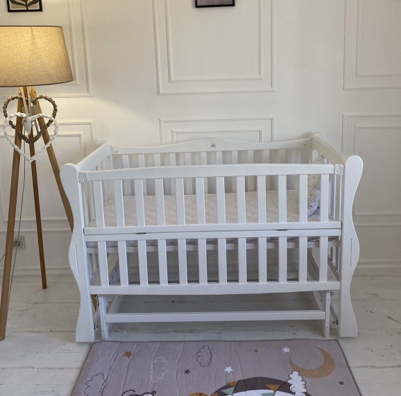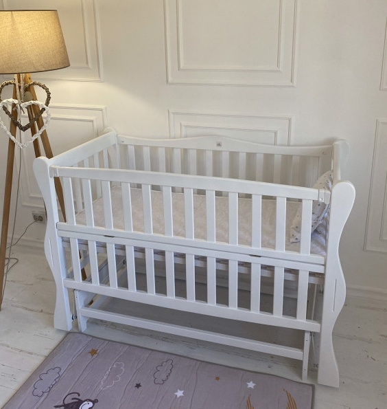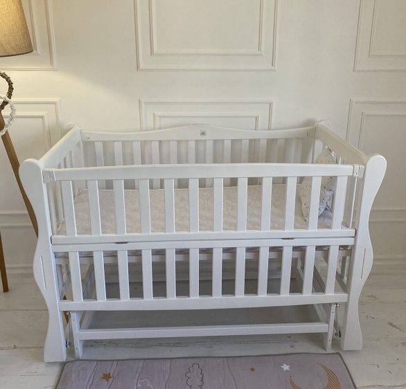 Pătuțul este prevăzut cu o bară laterală detașabilă, care servește drept barieră de protecție pentru bebeluș și în același timp îți ușurează accesul la bebeluș. Peretele lateral este fixat cu cleme de plastic. Mecanismul de legănare a patului este - pendul transversal. Prin urmare, cu ajutorul rulmenților metalici, părinții își pot adormi copilul în tăcere. Dacă este necesar, rulmenții pot fi fixați cu ușurință, iar patul va fi într-o poziție statică.
