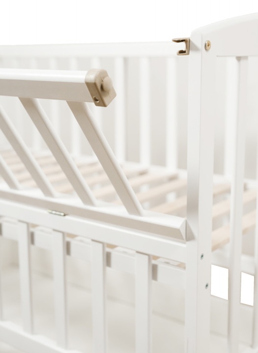 Pătuțul este prevăzut cu un panou lateral rabatabil, care servește drept barieră de protecție pentru bebeluș și în același timp îți ușurează accesul la bebeluș. Peretele lateral este fixat cu cleme de plastic.