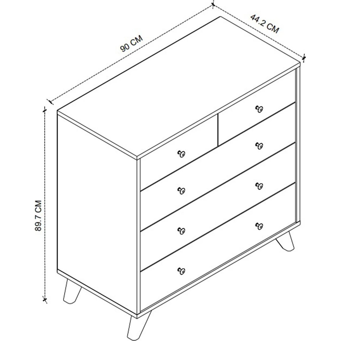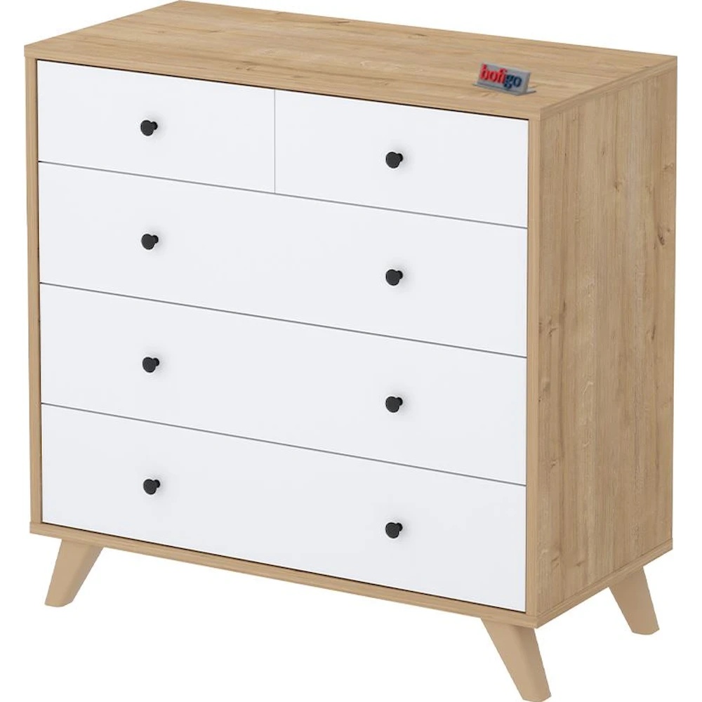 Cele 5 sertare permit depozitarea organizată a hainelor, lenjeriei, accesoriilor sau altor obiecte personale, contribuind la menținerea ordinii și a unui spațiu bine organizat.