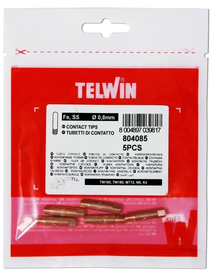 Setul de vârfuri de contact Telwin 804085 este un pachet cu 5 duze schimbabile, proiectate pentru sârmă de sudură cu diametrul de 0,8 mm. Sunt compatibile cu torţe MIG/MAG Telwin (de ex. modelele TW160, TW180 şi MT15). Aceste vârfuri asigură alimentarea constantă a sârmei şi menţinerea arcului electric stabil — lucru esenţial pentru suduri curate şi uniforme, în special la oţel şi inox. Înlocuirea vârfurilor uzate permite menţinerea calităţii sudurii şi prelungeşte viaţa torţei.