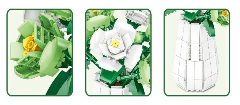 Setul permite asamblarea unui buchet de flori albe si verzi cu accente galbene, asezat intr-o vaza moderna alba. Rezultatul final este o decoratiune care aduce prospetime si stil oricarui interior - fie ca este vorba despre birou, living sau dormitor.
