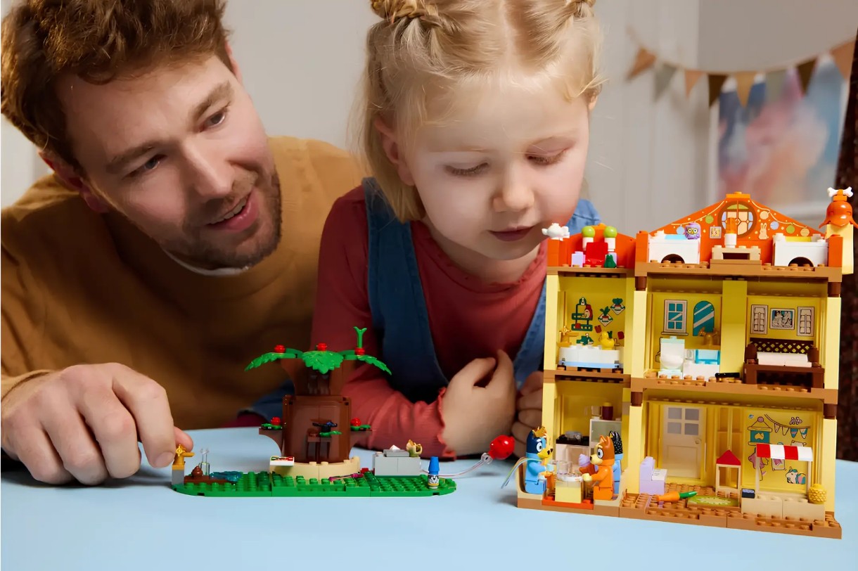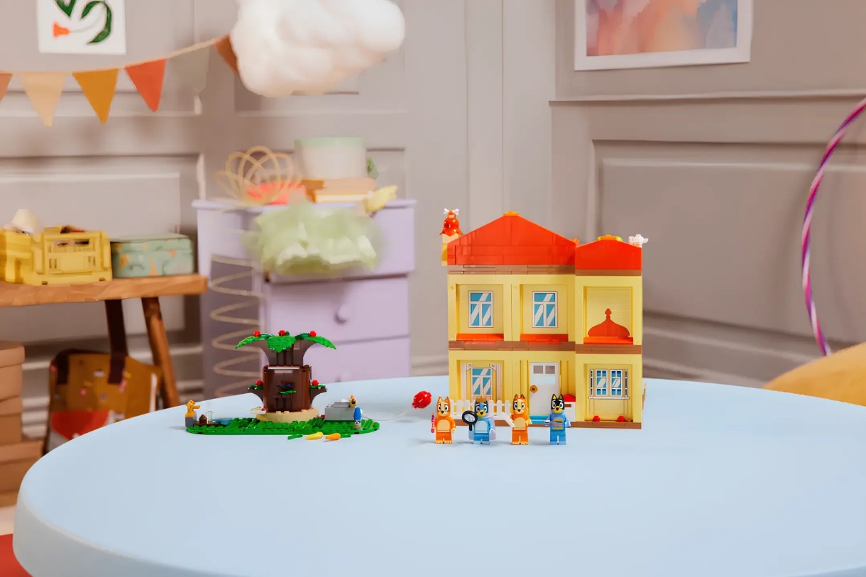 Acest set de joacă premium Casa Familiei lui Bluey (11203) este plin de elemente, jucării și personaje din serialul TV Bluey pentru a inspira distracție imaginativă prin jocuri de rol cu Bluey și familia ei, pentru copiii cu vârsta de 4 ani și peste. Casa de joacă modulară cu mai multe camere include 4 minifigurine - Bluey, Bingo, Chili (mama lui Bluey) și Bandit (tatăl lui Bluey) - plus accesorii, inclusiv o pelerină curcubeu, o baghetă magică și lupe. Toate camerele sunt detașabile pentru diferite opțiuni de joc. În interiorul camerei de joacă, există o casă de păpuși, un pian și un stand cu mâncare pentru distracție prin jocuri de rol. Bucătăria are frigider, cuptor, aragaz, masă și scaune. La etaj se află dormitorul mamei și al tatălui și o baie. Dormitorul de la mansardă al lui Bluey și Bingo are un covor, o lampă și o figurină Chattermax. Alături se află tronul Reginei cu ceainic, ceașcă și broască. Grădina găzduiește un copac mare, un hot dog, o pizza, un robinet de apă, piticul Jeremy și un balon cu aer cald care poate fi lansat în aer.