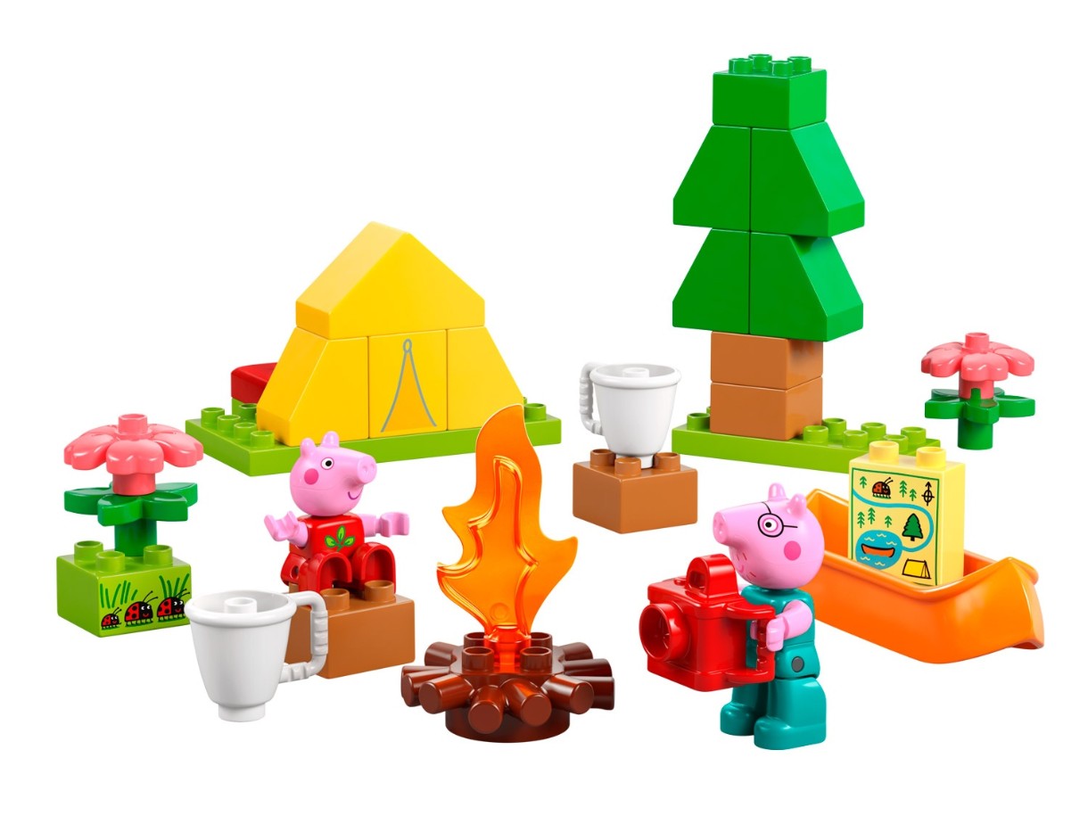 Micuții pornesc într-o aventură cu setul de joacă LEGO DUPLO Peppa Pig Aventură în aer liber (10452). Prin joc imaginativ, preșcolarii își explorează sentimentele legate de primele experiențe în timp ce își imaginează o excursie cu cortul alături de Peppa Pig și Daddy Pig, apoi explorează un râu într-o canoe de jucărie.