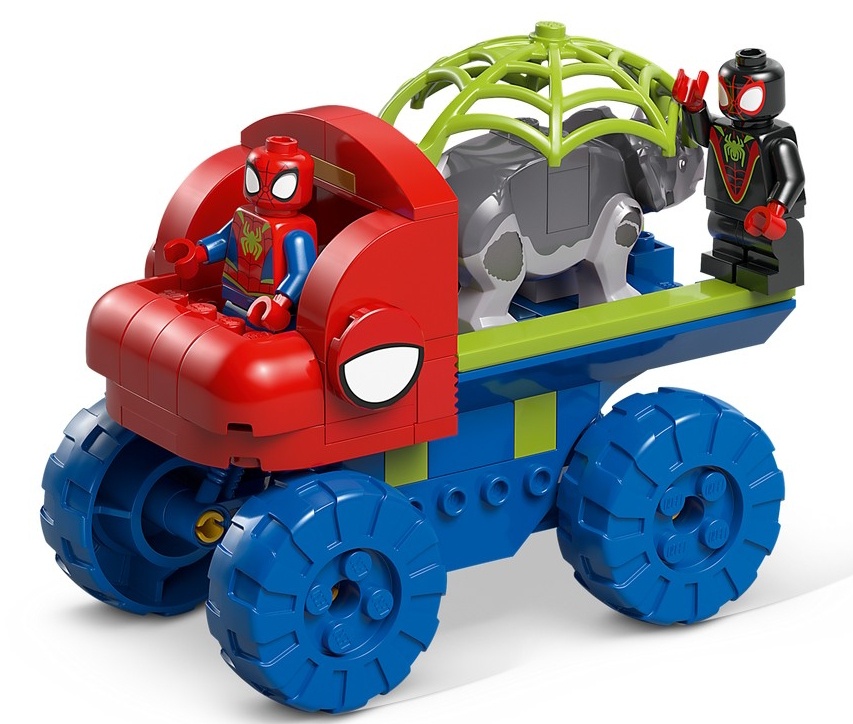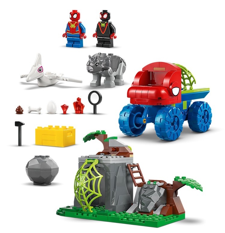 Acest set de joacă LEGO® include minifigurinele Spidey și Miles "Spin" Morales, plus 2 figurine dinozaur: Ghost Spider ca pterodactil și Rhino ca triceratops. De asemenea, conține LEGO Dino Crawler al lui Spidey cu o pânză mare atașată la spate, o funcție de cădere de pietre activată de un trăgaci, un ou de dinozaur de recuperat și o pânză care poate fi coborâtă pentru a prinde răufăcătorul.