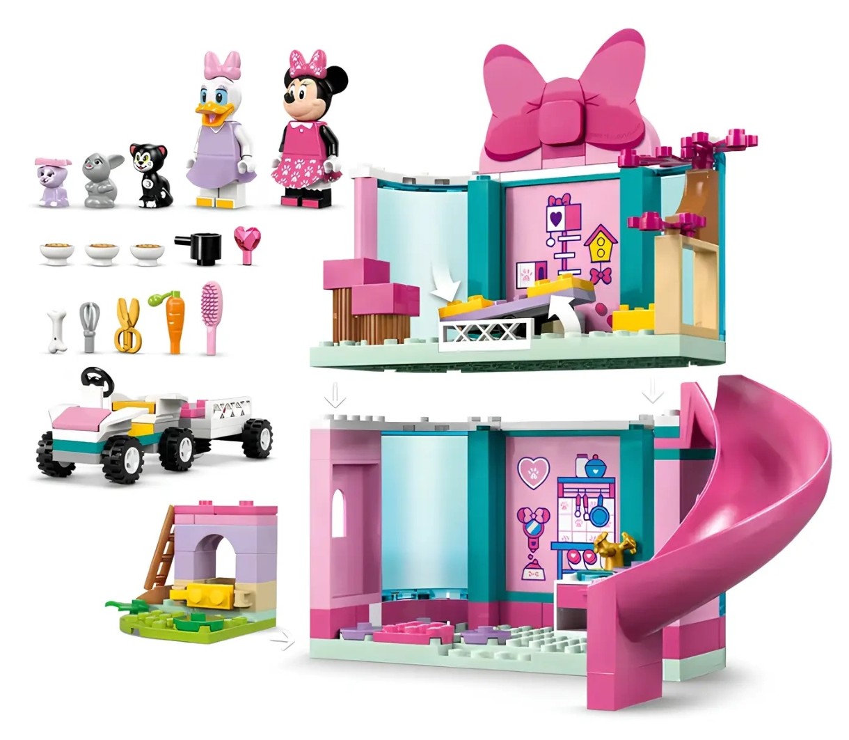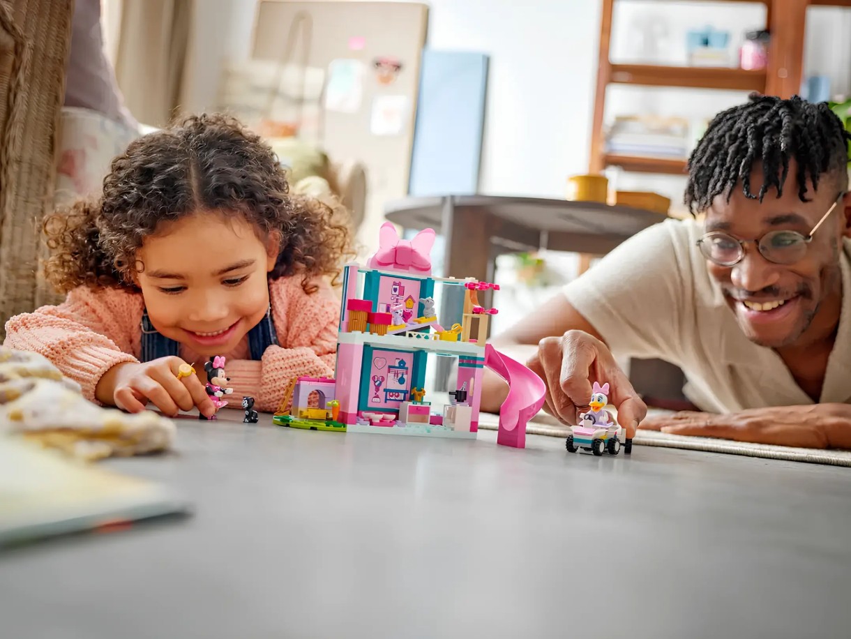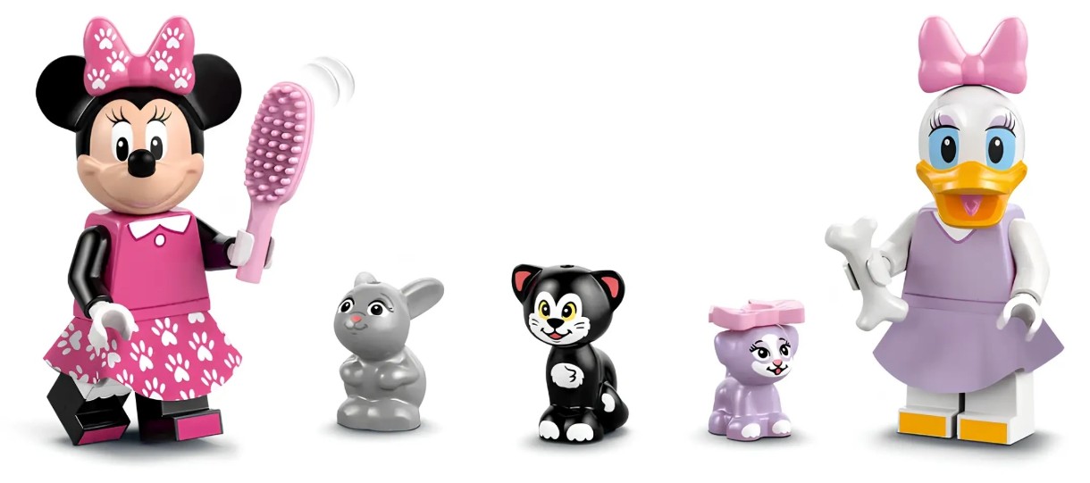 Fanii Clubului lui Mickey Mouse de la Disney, cu vârsta de 4 ani și peste, se pot distra învățând să construiască cu acest set LEGO Disney Hotelul Animalelor de Companie al lui Minnie (43274). Această idee de cadou pentru copiii mici prezintă un hotel pe 2 niveluri cu tobogan, bucătărie de joacă și cușcă pentru iepuri, o mașină cu o remorcă mică și multe altele. Setul include Minnie Mouse și Daisy Duck din setul de minifigurine LEGO Disney, plus Figaro, Creampuff și Mama Bunny din setul de animale de companie LEGO Disney.