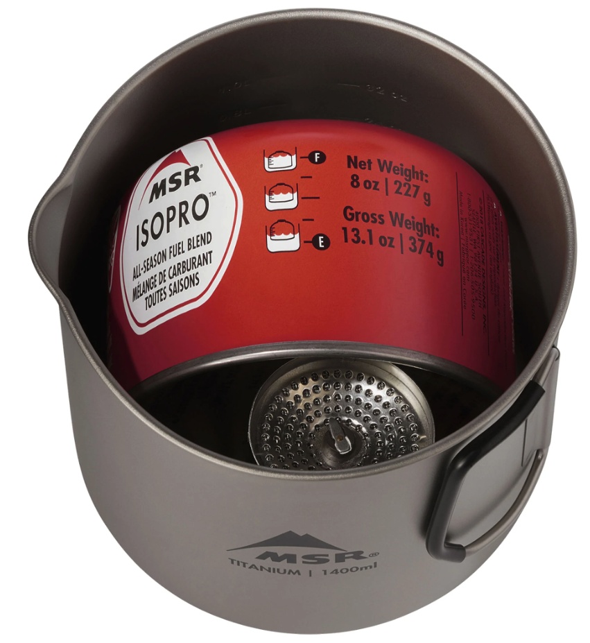 Ceainic de drumeție ușor și rezistent MSR Titan (1400 ml) – ideal pentru cuplurile care preferă aventurile cu rucsacul în spate. Construcția din titan oferă un echilibru perfect între greutatea redusă și durabilitate – soluția perfectă pentru drumeții de lungă durată și expediții outdoor.Scala gradată din interior permite măsurarea rapidă și precisă a cantității de apă, iar gura de turnare îmbunătățită asigură o turnare curată, de exemplu, în pungi cu alimente liofilizate. Mânerele acoperite cu silicon oferă o prindere sigură și confortabilă, chiar și atunci când sunt fierbinți sau când porți mănuși.Capacul se fixează bine și este echipat cu un cârlig din silicon, care permite agățarea fără a-l murdări. Toate ustensilele de bucătărie din seria Titan se pot împacheta compact una în alta: în interiorul ceainicului încape un arzător și un recipient pentru combustibil, creând astfel un set de gătit eficient și bine organizat.