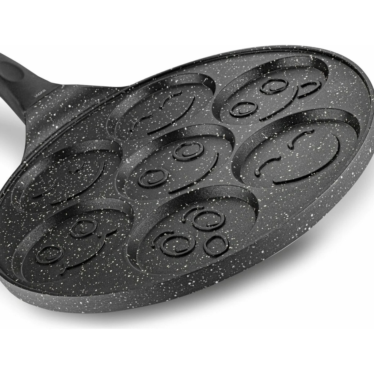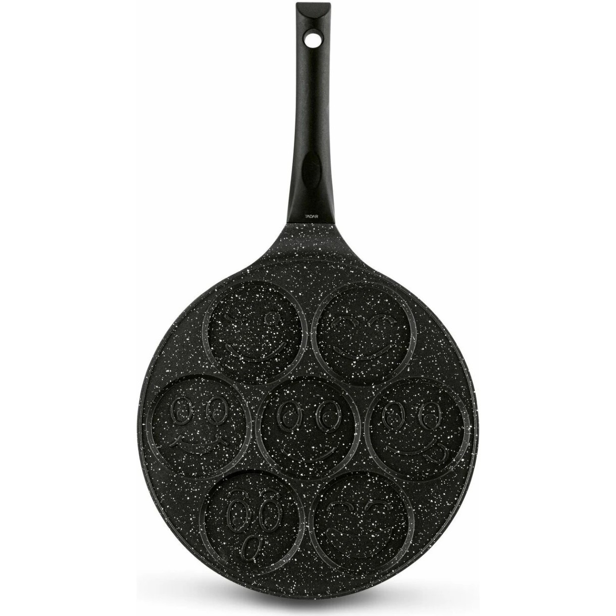 Tigaia Tadar Marble Smiley Faces de 26 cm pentru clătite, gogoși și ouă prăjite este ușor de curățat. Mânerul vă protejează de arsuri, deoarece se încălzește mai lent decât mânerele din metal. Acest lucru va fi benefic pentru multe mese pe parcursul zilei.