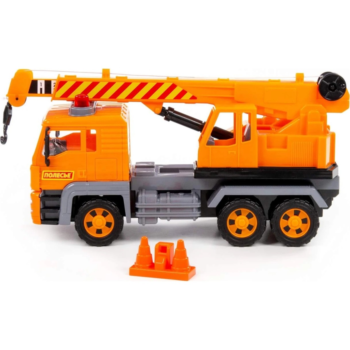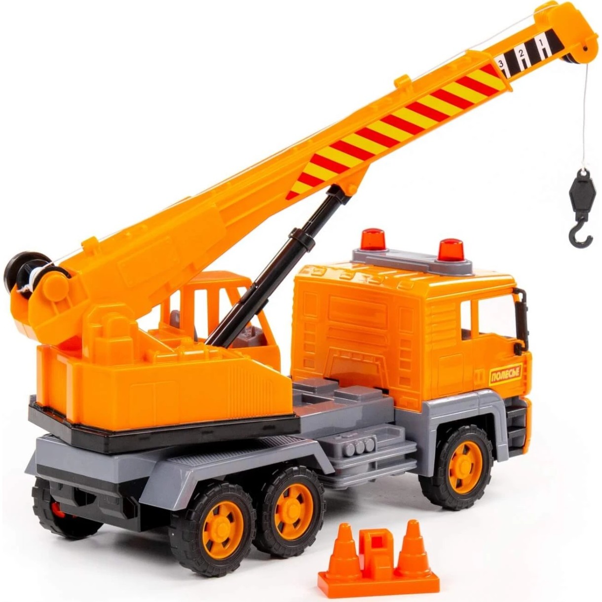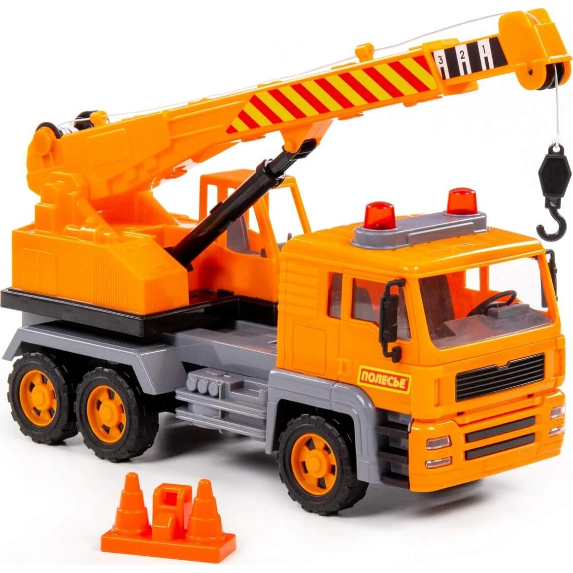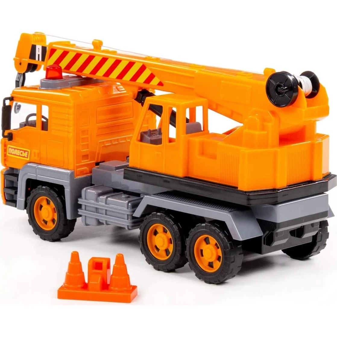 Construcția include trei perechi de roți pentru stabilitate. Setul conține și conuri de construcție care completează jocul.