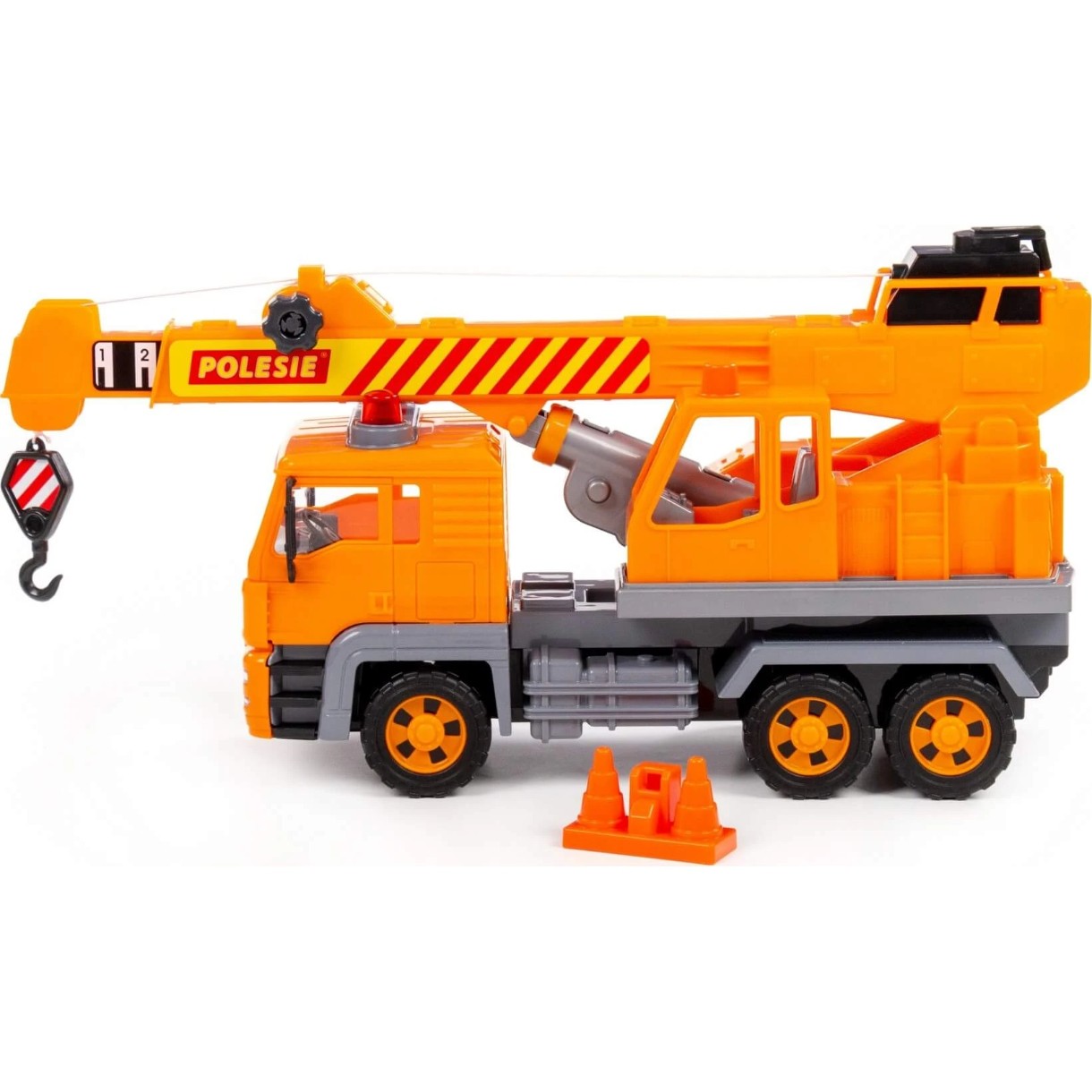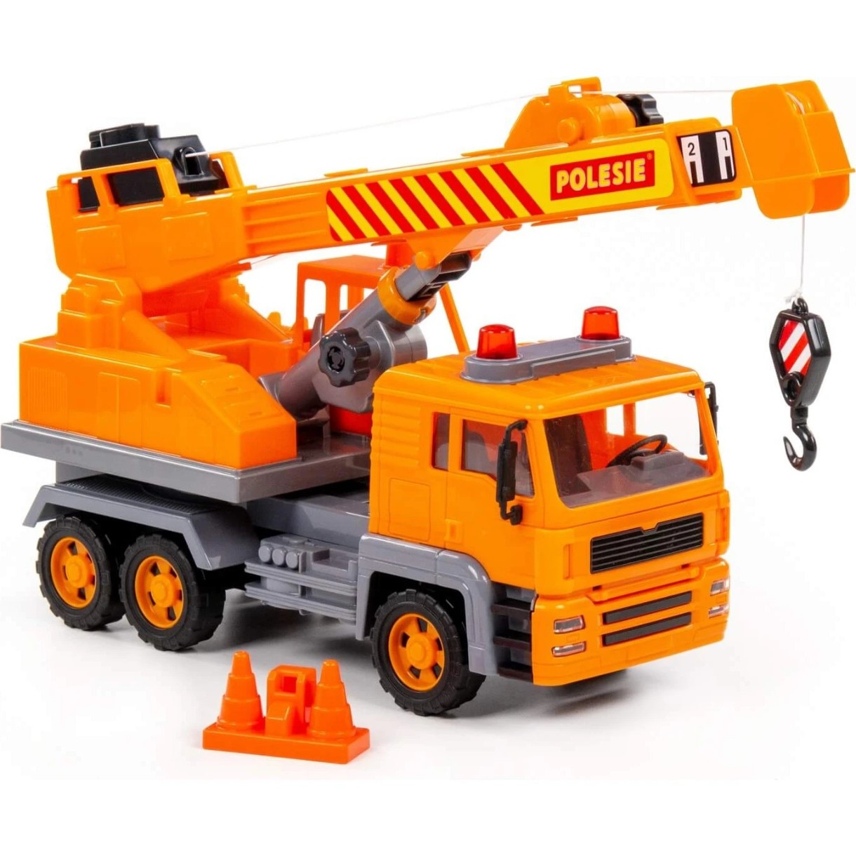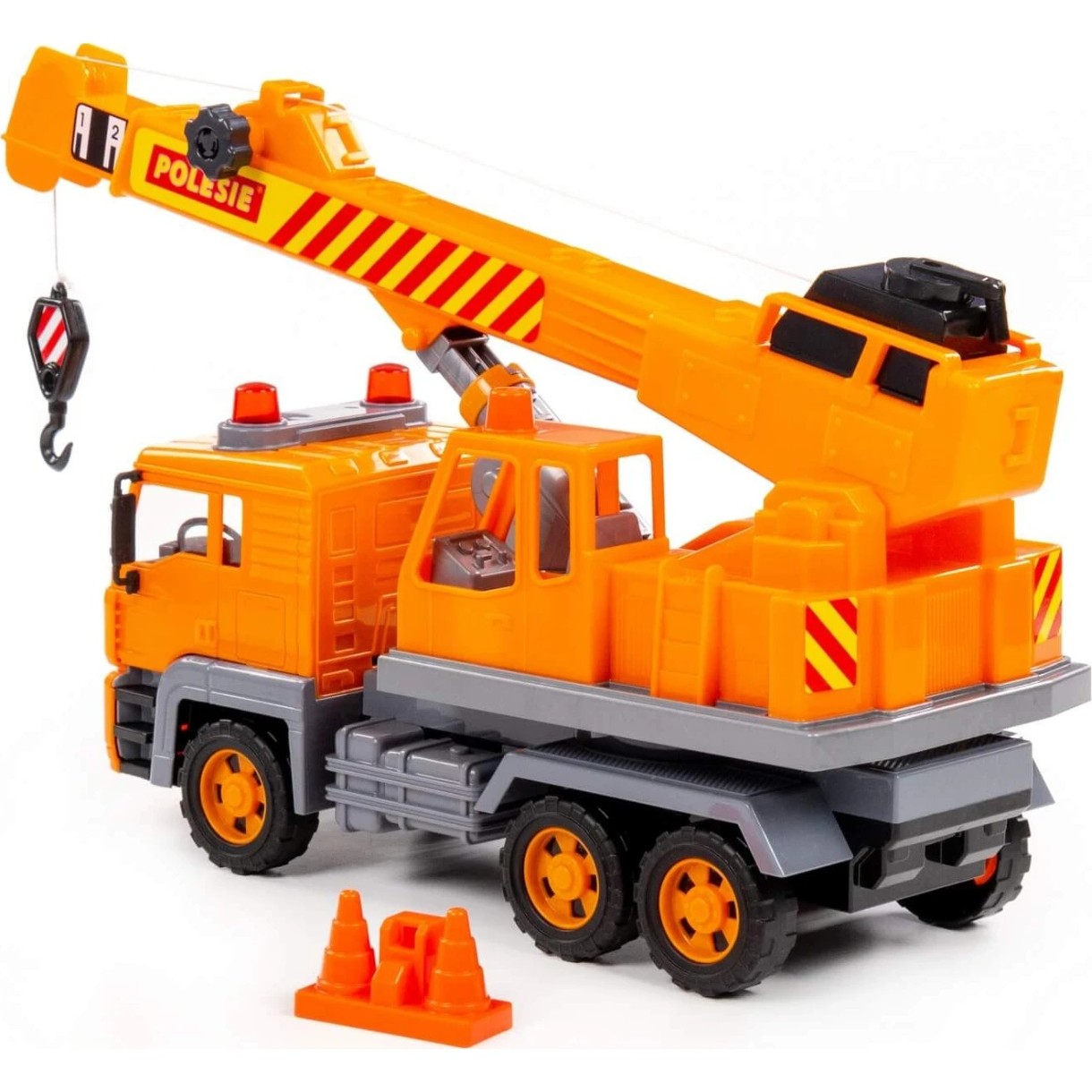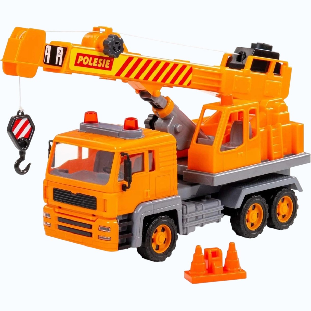 Construcția include trei perechi de roți pentru stabilitate, iar setul conține și conuri de construcție care completează jocul.