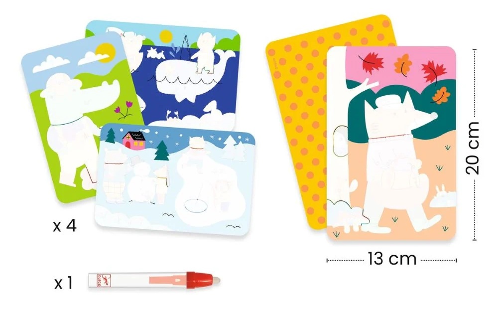 In set4 planșe ilustrate din plastic moale (13 x 20 cm) cu un strat alb care dispare, 1 creion cu rezervor de apă, 1 bază din carton gros
