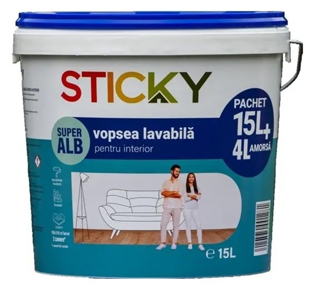 Vopseaua Sticky 2310023 este o vopsea acrilică superlavabilă pe bază de apă, ideală pentru spații care necesită curățare frecventă, precum bucătăriile și băile. Este realizată din copolimeri acrilici în dispersie apoasă, pigmenți, umpluturi și aditivi speciali care asigură o rezistență ridicată a stratului. Vopseaua se aplică ușor și oferă un rezultat uniform, acoperind eficient suprafața dintr-un singur strat, economisind timp și material. Se poate aplica cu trafaletul, pensula sau prin pulverizare, formând un finisaj curat, fără stropire sau dungi. Poate fi colorată cu pigmenți pentru vopsele minerale pe bază de apă sau prin sistem computerizat de nuanțare, oferind flexibilitate în design.
