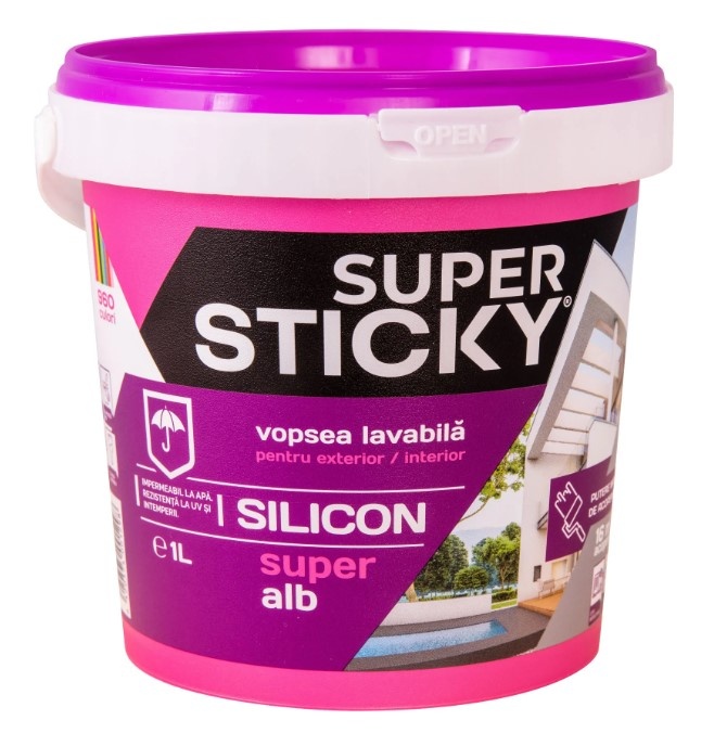 Vopseaua Sticky 2310036, 1 l este o vopsea de interior de înaltă calitate, pe bază de copolimeri acrilici, umpluturi și adaosuri de silicon. Se aplică ușor pe diferite suprafețe, oferă o acoperire bună și un strat uniform și durabil. Aderența este excelentă pe pereți bine pregătiți, iar vopseaua rezistă la frecare și curățări repetate, facilitând întreținerea. Este potrivită pentru locuințe, birouri, școli, spitale și alte spații comerciale, combinând practicitatea cu un aspect estetic.
