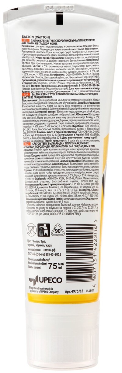 Orice pantofi din piele își pot pierde cu ușurință aspectul original dacă îngrijirea zilnică este neglijată. Când cumpăr o altă pereche de pantofi, cizme sau cizme noi, vreau să servească cât mai mult timp și să arate îngrijit. Crema de pantofi Salton într-un tub cu aplicator este o modalitate excelentă de a oferi îngrijire cuprinzătoare pentru pantofii din piele și de a le menține atractive. Aplicatorul de spumă convenabil ajută la aplicarea uniformă a cremei, fără contact, astfel încât mâinile tale să rămână curate. Consistența moale, fără componente agresive, îngrijește delicat pantofii, face pielea moale, conferă suprafeței luminozitate și strălucire. Crema de pantofi Salton poate fi folosită pentru pantofii din piele naturală și artificială neagră. Fiecare pachet conține două tuburi de 75 ml. Alegând Salton Shoe Cream, faceți îngrijirea pantofilor din piele mai comodă și mai ușoară!