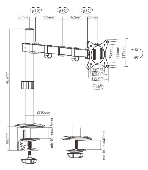 Standard VESA75x75, 100x100 mm