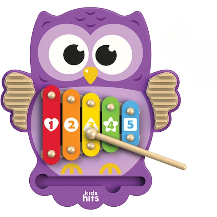 Acest xilofon în formă de bufniță este un instrument minunat de învățare creativă, permițând copiilor să exploreze concepte muzicale simple prin joacă. Având cinci clape colorate, o zornăitoare pe aripile bufniței și un ciocan de lemn care poate fi depozitat într-un compartiment special, această jucărie este concepută pentru a ajuta copiii să își dezvolte primele abilități muzicale prin joc practic, învățând forme, culori și numărând de la 1 la 5. Jocul cu acest prim instrument muzical îi va ajuta pe cei mici să dezvolte un sentiment de împlinire!