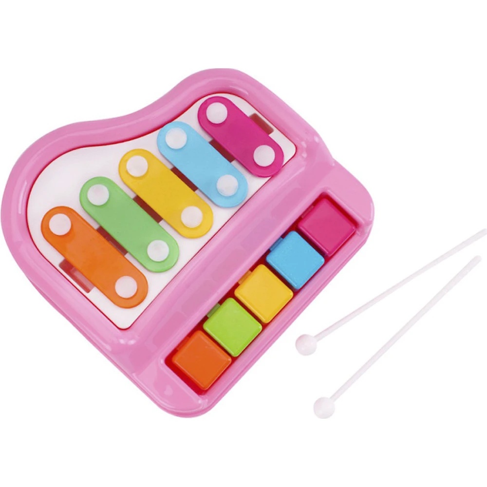 Vă propunem o variantă modernă de xilofon pentru cei mici. Xilofonul-pian de jucărie de la TechnoK combină două instrumente muzicale: xilofonul și pianul cu clape. Pentru a cânta la xilofon, setul include 2 bețișoare speciale. Jucăria este recomandată copiilor de la 2 ani, deși, fără îndoială, este interesantă și pentru cei mai mici.