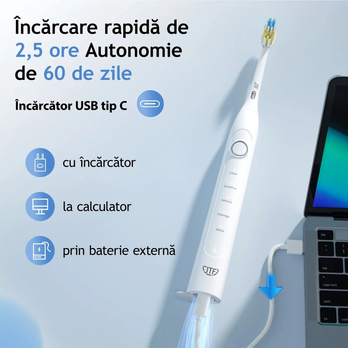 Descoperă Periuța de dinți electrică JTF Sonic, P100, un dispozitiv modern și eficient pentru o igienă orală superioară.