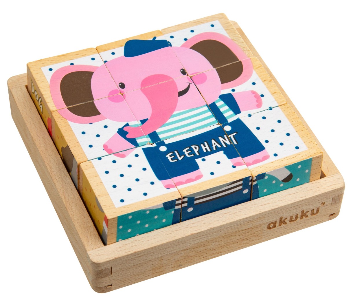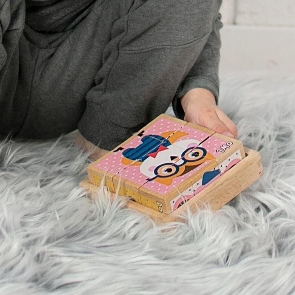 Copilul învață forme, culori și diferite animale. Tava din lemn facilitează stivuirea, transportul și depozitarea blocurilor. Fiecare cub are 6 laturi și poți crea 6 imagini diferite. Sunt fabricate din lemn sigur și ecologic. Cernelurile folosite pentru imprimare indeplinesc cerintele si sunt complet sigure pentru cei mici. Constă din 9 cuburi + ambalaj.