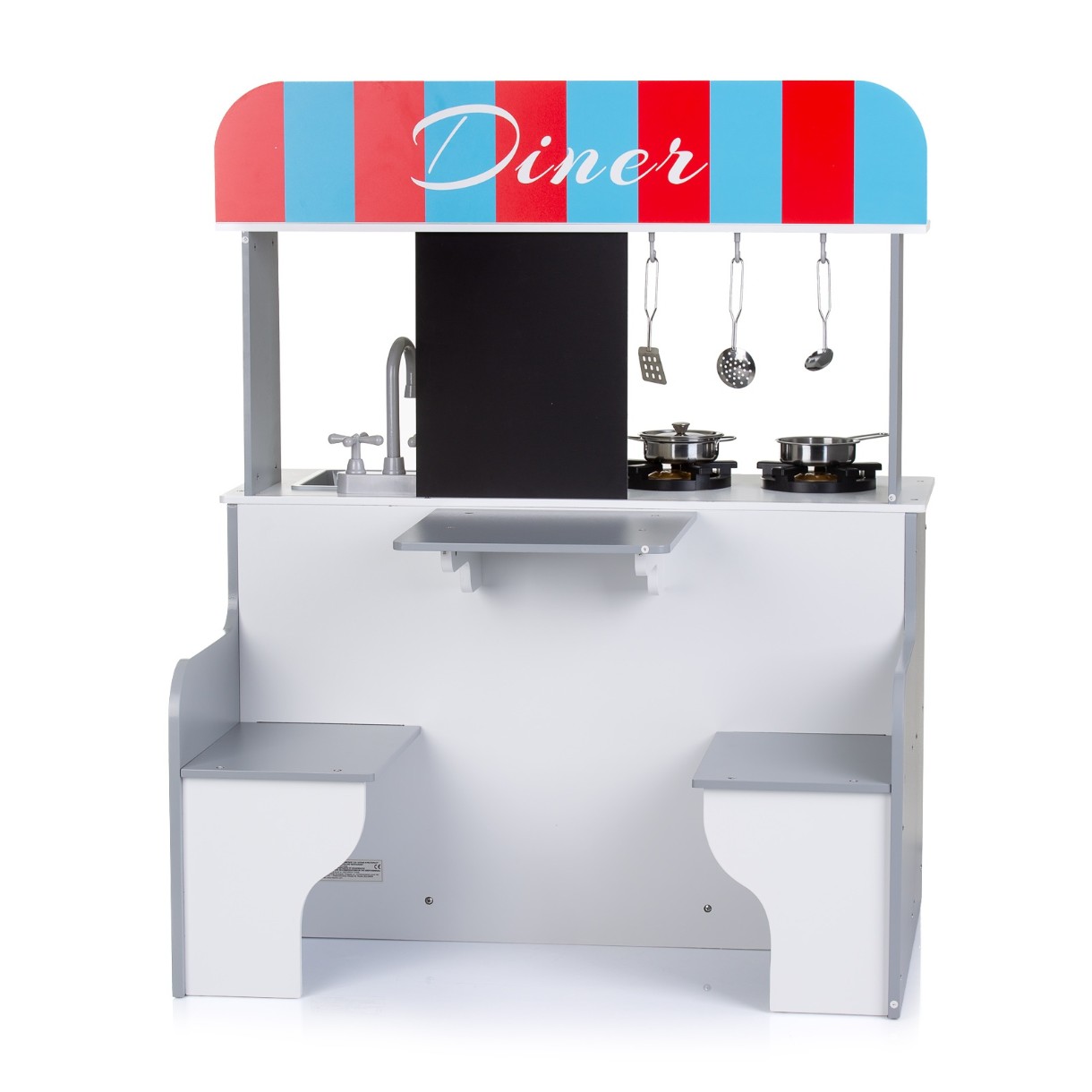 Set 2 în 1 pentru copii - Bucătărie și restaurant (98 cm) cu 5 ustensile de bucătărie metalice - pentru dublu - pentru dublă distracție! Un set distractiv unde copiii se pot juca de-a gătitul și restaurantul în același timp, pot interpreta diverse situații de joc de rol și se pot distra cu prietenii. Pe o parte se află bucătăria, pe cealaltă - un loc confortabil și intim pentru doi copii cu o masă - ca într-un restaurant adevărat.