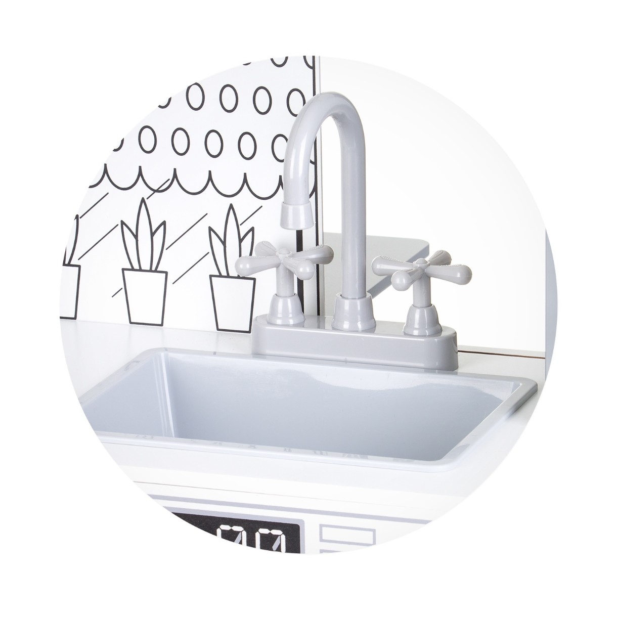- Toate ușile bucătăriei se deschid, astfel încât copiii să se simtă ca într-o bucătărie adevărată. Pot mișca și roti mânerele, pot pune mâncare în dulapuri.
