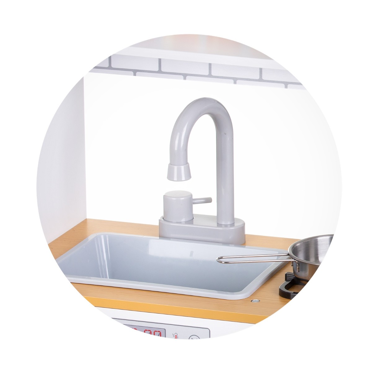 - Toate ușile se deschid, permițând copiilor să experimenteze o bucătărie adevărată. Pot mișca și roti mânerele și pot aranja mâncarea în dulapuri.