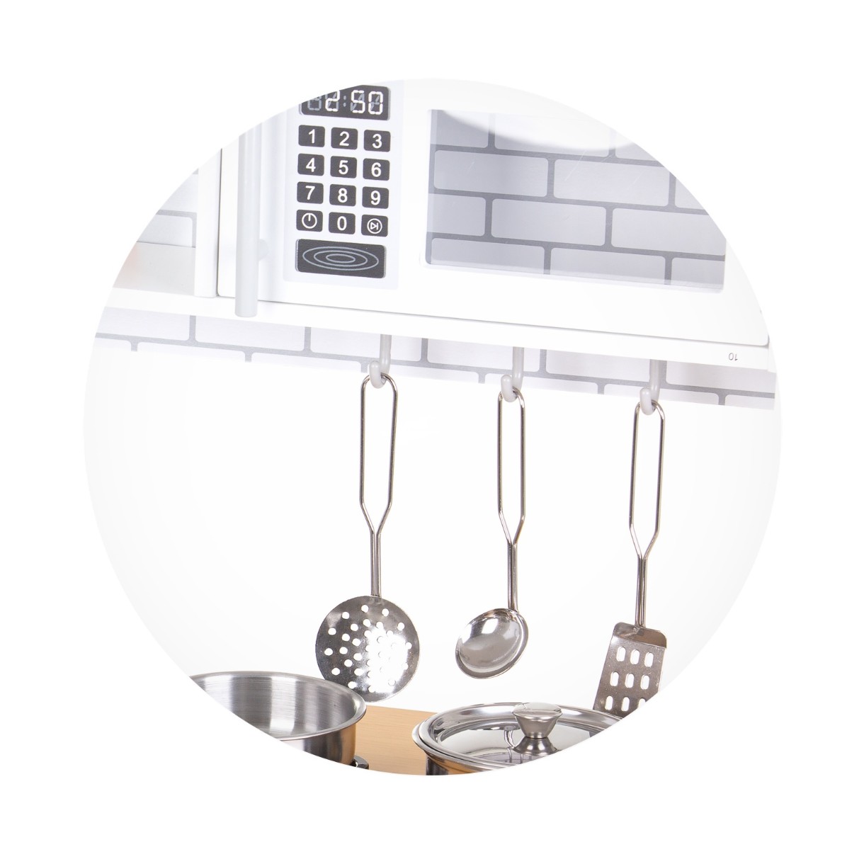 - Material: MDF E1 + furnir de lemn pentru corp, metal pentru ustensile și oale, piese din plastic, autocolante din hârtie;