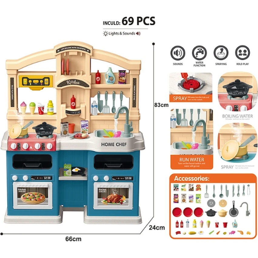 Setul include piese pentru asamblarea blatului de bucătărie, un set de veselă, un set de ustensile și aparate de bucătărie, precum și figurine ce imită alimentele.