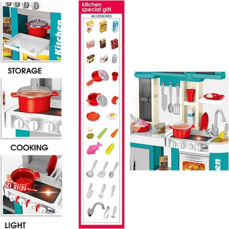 Modul de joacă interactiv „Bucătărie” – bucătărie elegantă în nuanță albastră, realizată din plastic sigur pentru copii. Este echipată cu plită funcțională cu imitație de arzătoare și cuptor, cu un cuptor încorporat și geam pentru a urmări procesul de gătit. Deasupra plitei se află rafturi și cârlige pentru depozitarea vaselor și alimentelor. Setul include copii realiste ale produselor alimentare și veselă din plastic sigur: oale, tigăi, farfurii, linguri, furculițe și cuțite. Dispune de chiuvetă cu robinet pentru spălarea vaselor.