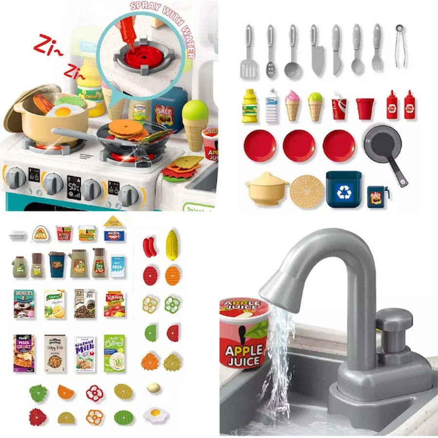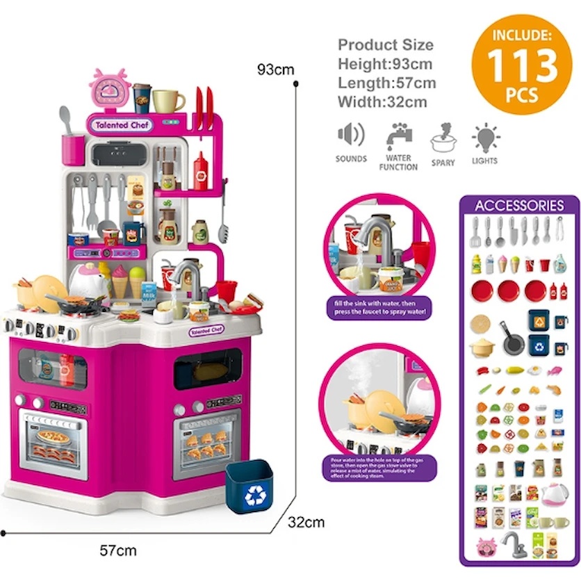 Modul de joacă interactiv „Bucătărie” – bucătărie elegantă în nuanță de roz, realizată din plastic sigur pentru copii. Este echipată cu plită funcțională cu imitație de arzătoare și cuptor, cu un cuptor încorporat și geam pentru a urmări procesul de gătit. Deasupra plitei se află rafturi și cârlige pentru depozitarea vaselor și alimentelor. Setul include copii realiste ale produselor alimentare și veselă din plastic sigur: oale, tigăi, farfurii, linguri, furculițe și cuțite. Dispune de chiuvetă cu robinet pentru spălarea vaselor.