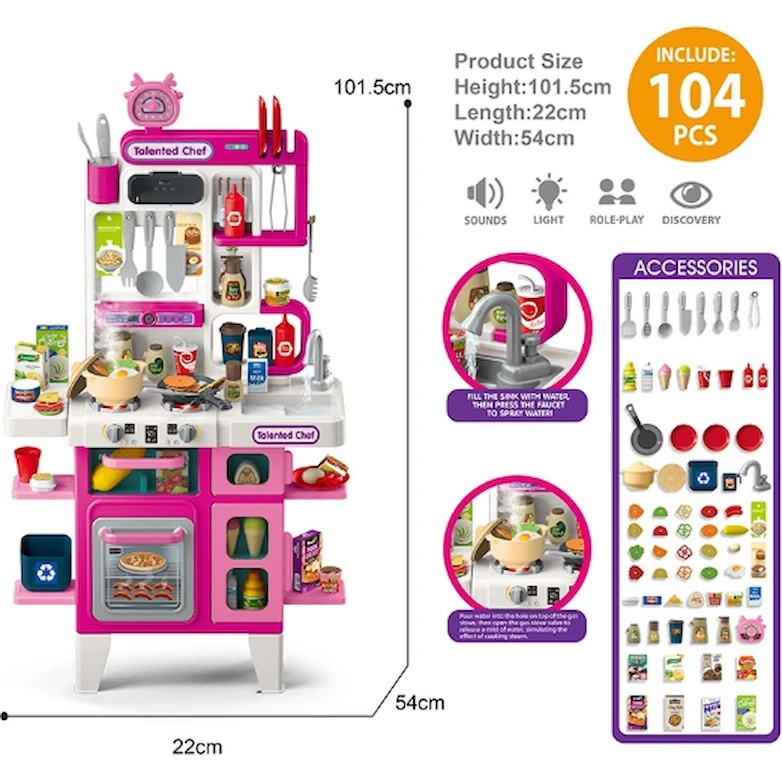 Setul de joacă pentru copii „Bucătărie” include 104 piese și este cadoul perfect pentru micii bucătari. Setul conține plită cu arzătoare, cuptor, chiuvetă și numeroase accesorii: oale, tigăi, tacâmuri, veselă și produse alimentare simulate. Toate piesele sunt realizate din plastic sigur pentru copii.