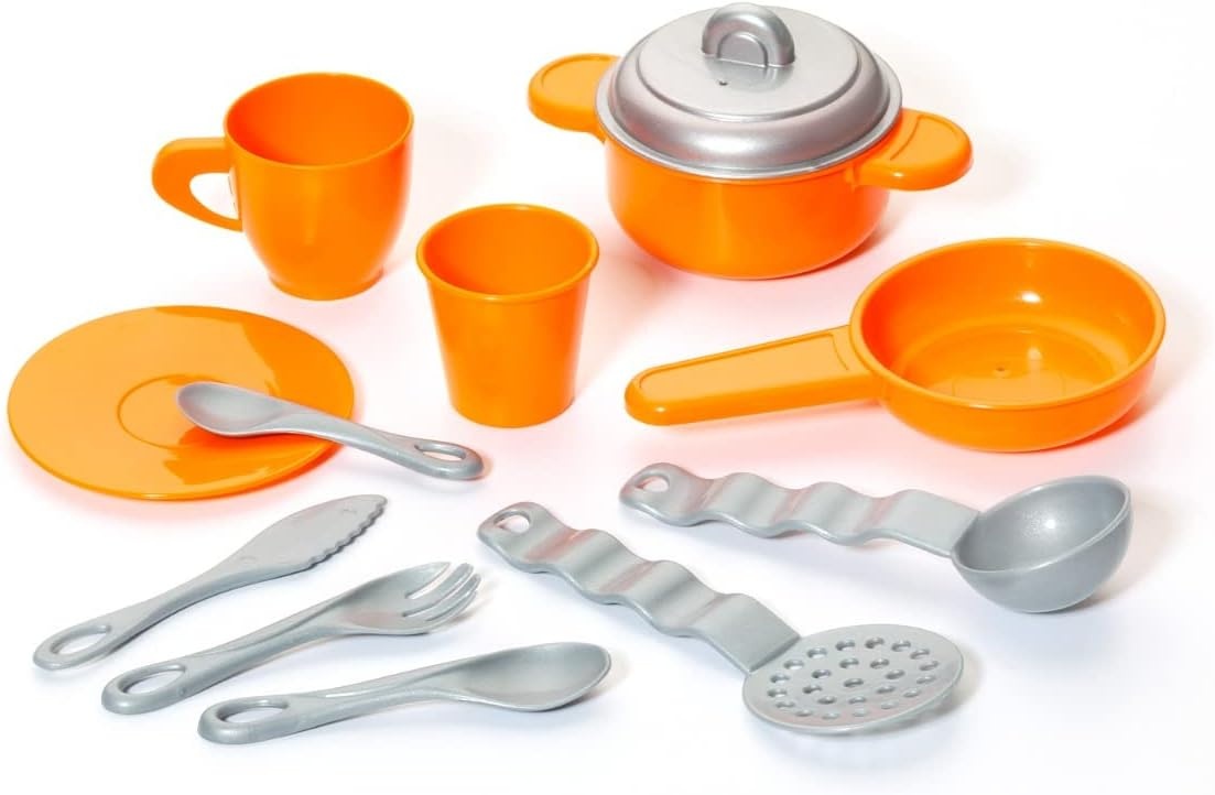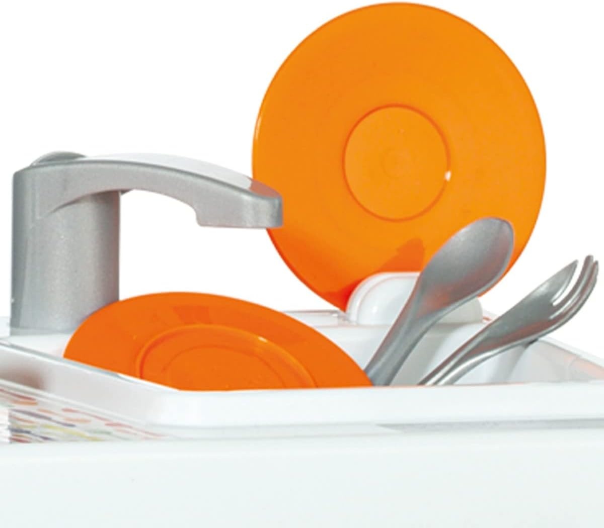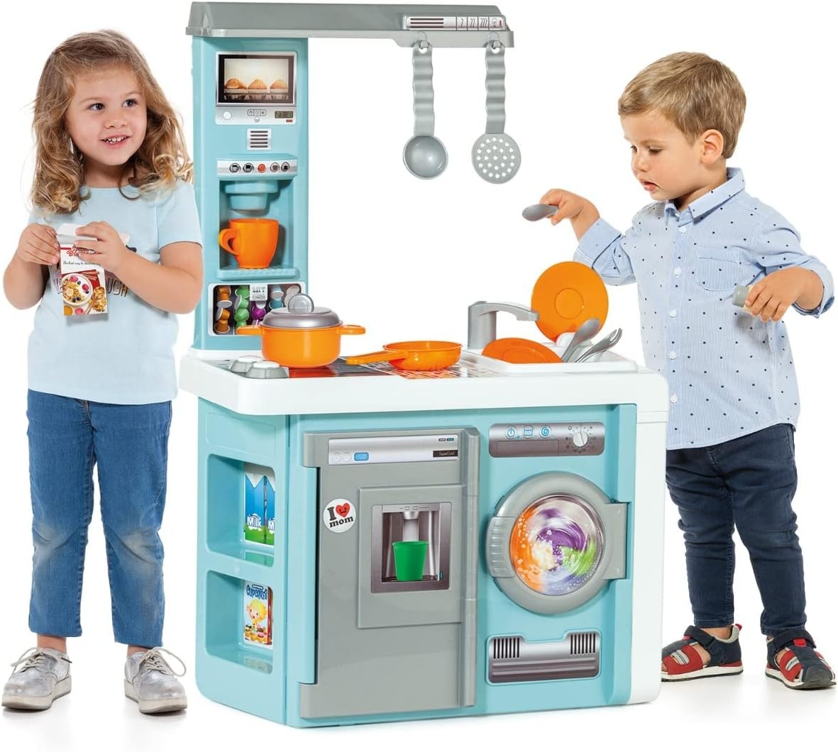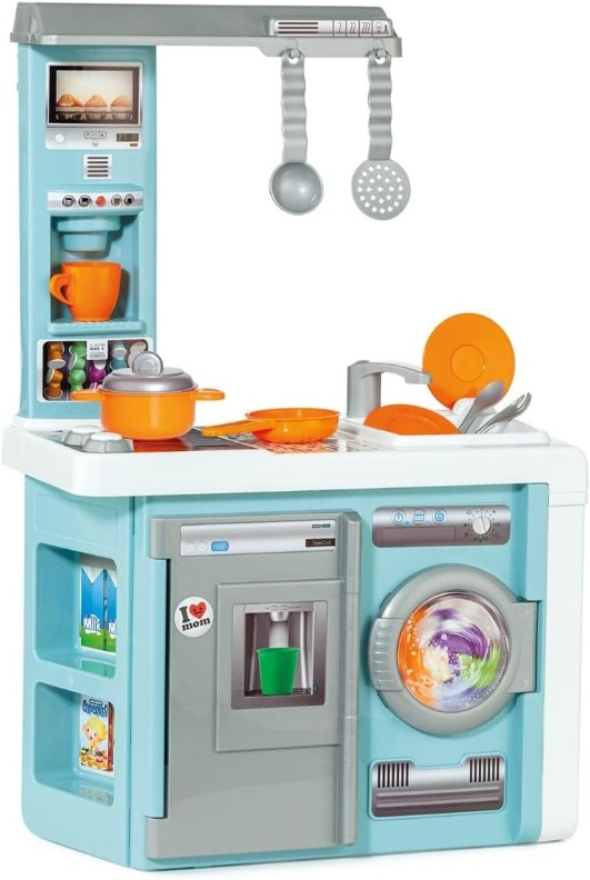 O bucătărie fabuloasă pentru copii cu cuptor, hotă, cuptor cu microunde, mașină de spălat și alte 12 accesorii. Ușile se deschid și se închid, simulând o bucătărie adevărată.