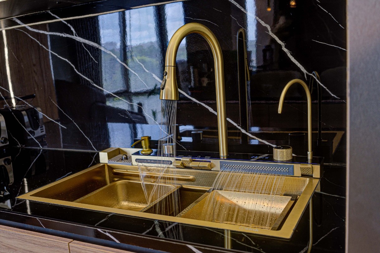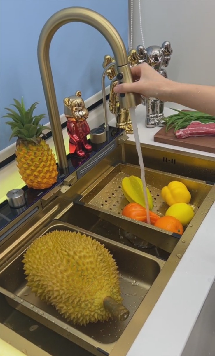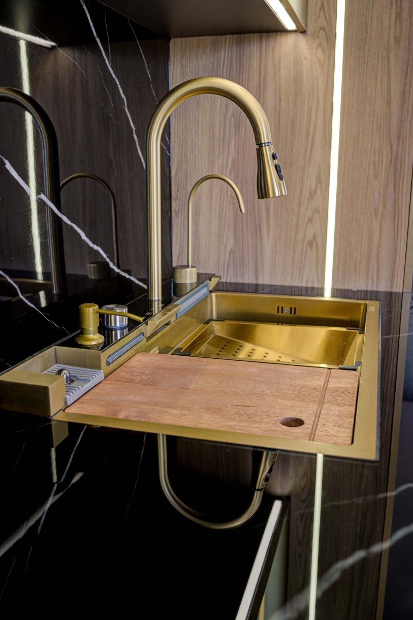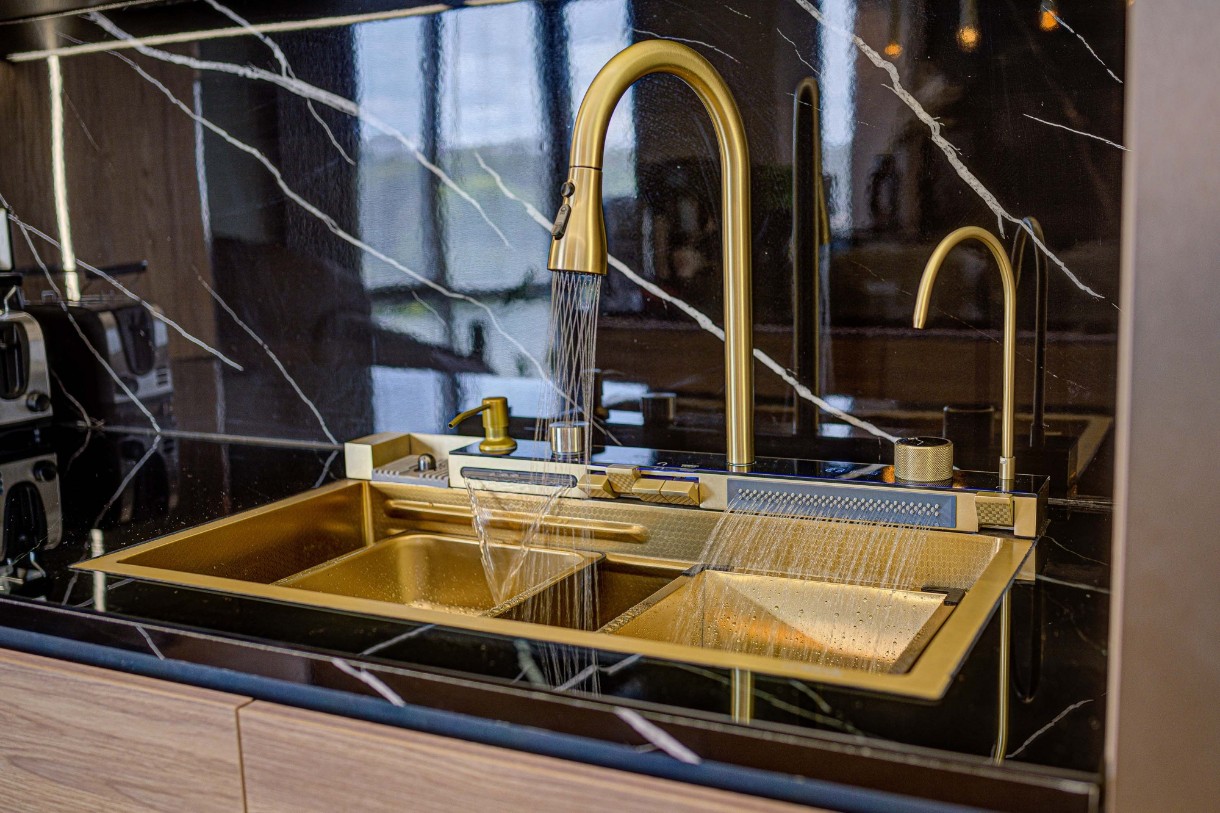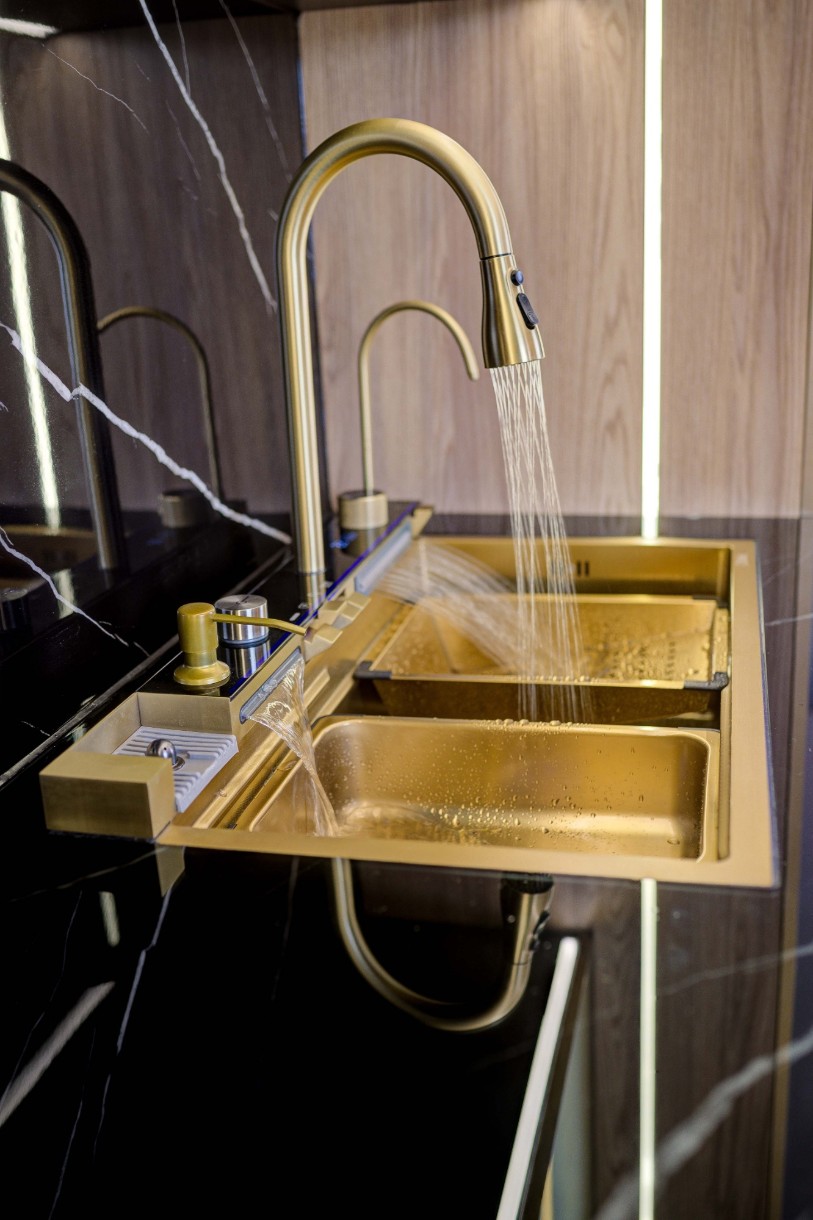 Inclus în setrobinet cu prelungitor 60cm (3 regimuri de spalare), robient apa filtrata, spălător de pahare, dozator, 2 robinete tip cascada, display temperatura digital si iluminare led, suport pentru spalare, suport pentru spălare perforat, socator de lem