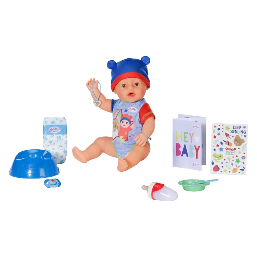 Păpușa Baby Born Jonas este un mic prieten vesel și drăguț, care plânge cu lacrimi reale, mănâncă, bea și merge la oliță! Mânuțele și piciorușele mobile permit schimbarea ușoară a hainelor, iar suzeta magică deschide și închide ochii. Setul include: haine, biberoane, suzetă, scutece, farfurioară cu linguriță, oliță, brățară de prietenie și album cu stickere. Jucăria perfectă pentru joacă și îngrijirea bebelușului!