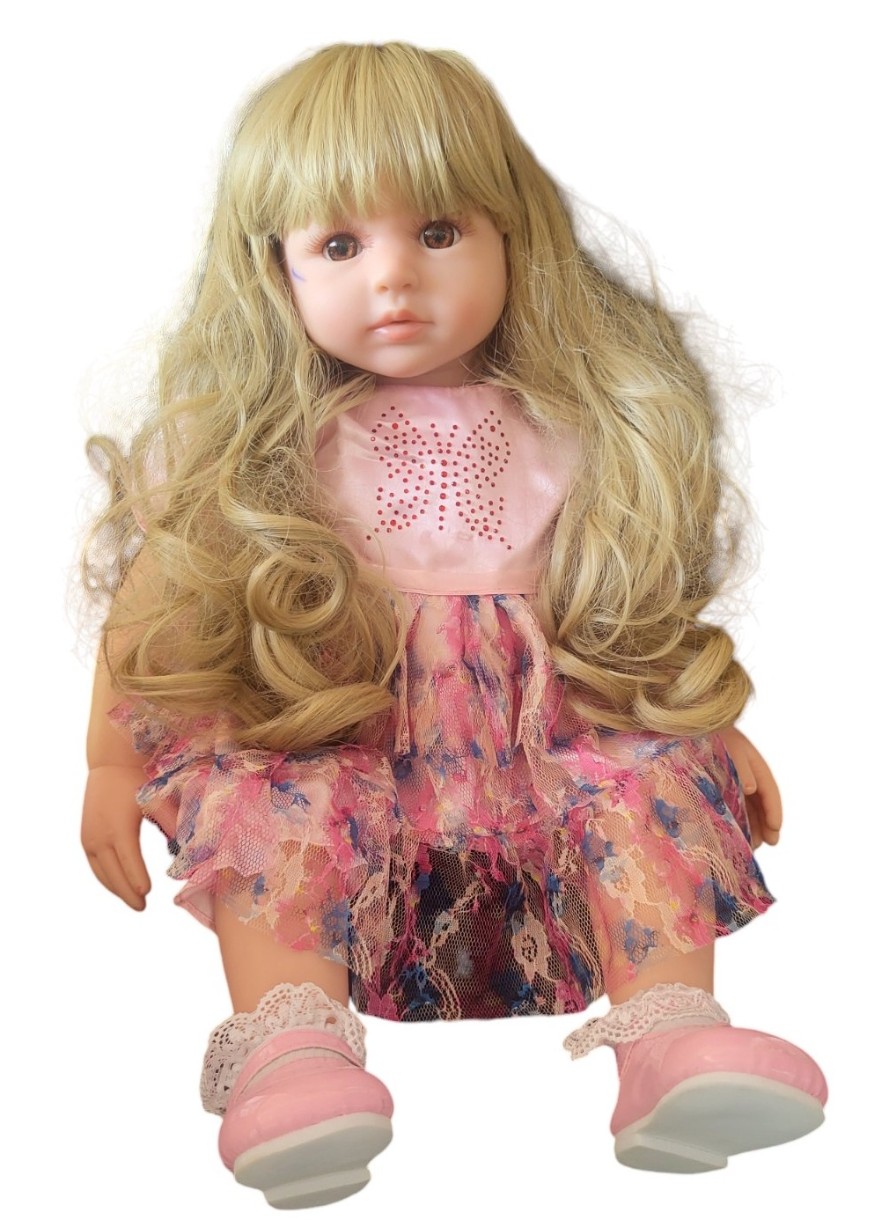 Fabricată în întregime din vinil de înaltă calitate, are gene false și păr cusut manual din mohair premium moale. Necesită îngrijire și poate fi chiar spălat.