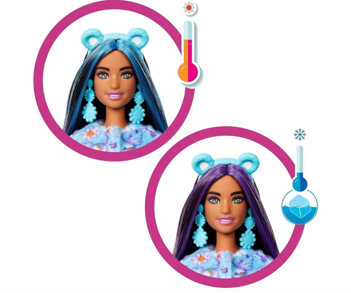 Una dintre cele mai uimitoare caracteristici ale păpușii este capacitatea sa de a se transforma. Pur și simplu folosește apă rece pentru a schimba culoarea părului lui Barbie, iar apa caldă o va readuce la starea inițială. Acest efect magic poate fi repetat iar și iar, de fiecare dată surprinzând și inventând noi scenarii de joacă.