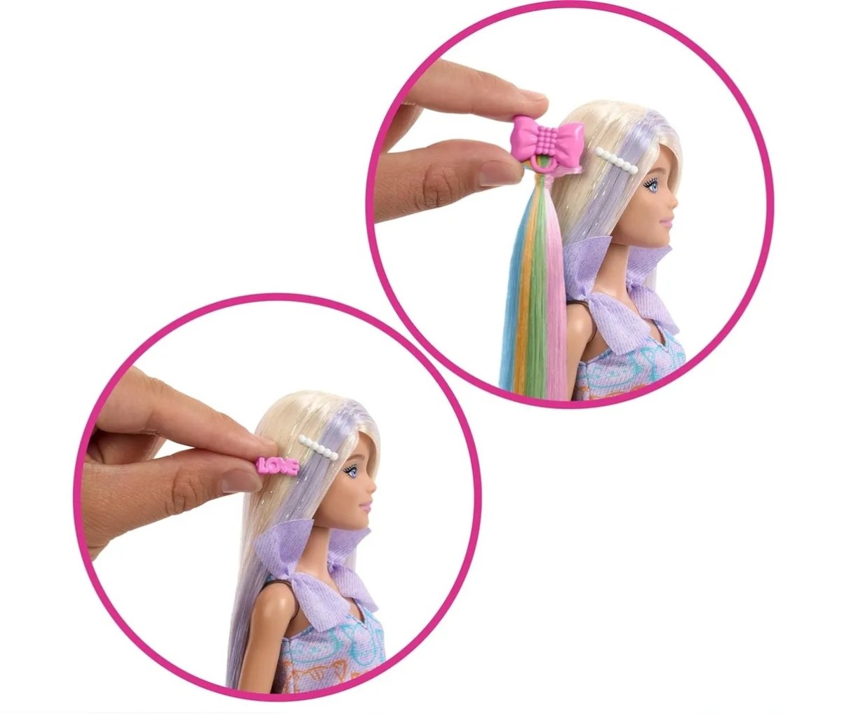 Păpușa Barbie Play Blonde este o fată fermecătoare, cu părul lung de 22 cm (8,5 in) împodobit cu șuvițe imaginative. Aspectul ei este vibrant, cu o rochie cu imprimeu de pisică, două funde mari pe umeri și cizme albe. Îi poți schimba aspectul cu accesoriile incluse și poți crea o nouă coafură.