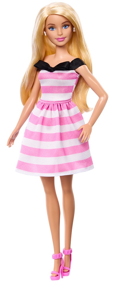 Păpușa Barbie poartă o rochie dulce, roz și alb, cu umerii goi și o fundă contrastantă neagră la gât.