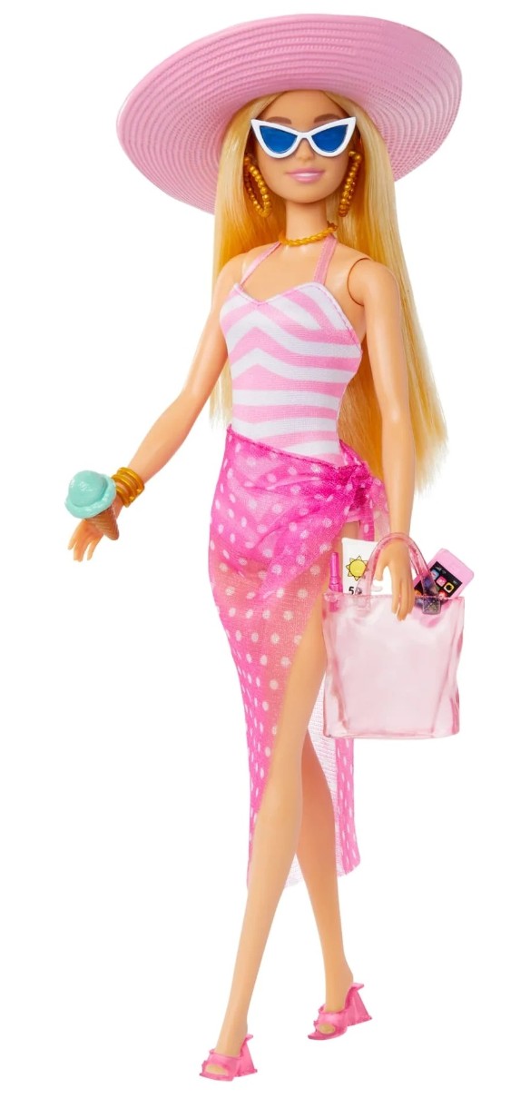 Păpușa Barbie poartă un costum de baie frumos roz și alb cu dungi, cu un șal de plajă transparent cu buline legat în talie. Cerceii hoop aurii și sandalele cu vârful deschis adaugă un plus de adorabilitate!