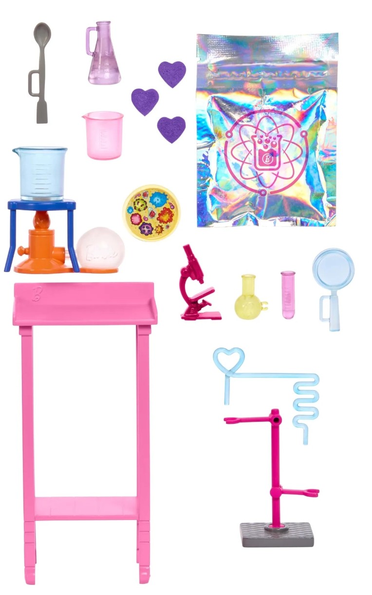 Ea poartă ochelari de protecție, iar setul include peste 10 accesorii de cercetare: un microscop, o lingură, diverse recipiente gradate, o eprubetă, o placă Petri, o lupă, o bancă de laborator, un suport pentru echipamente și alte câteva caracteristici interesante.