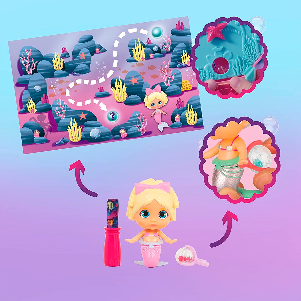 Complectatie1 geantă coajă, 1 păpușă sirenă, 1 cheie stea, 1 sticlă, 1 hartă a comorilor, 1 perlă cu mini accesoriu (surpriză), 1 suport perle, instrucțiuni