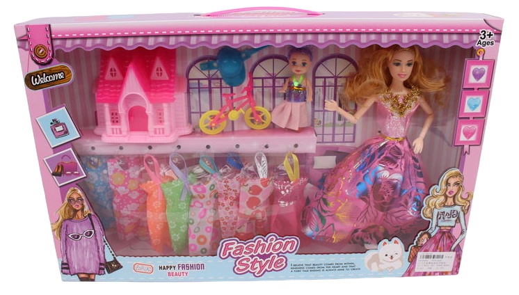 Complectatie2 păpuși, casă, bicicletă, seturi de îmbrăcăminte