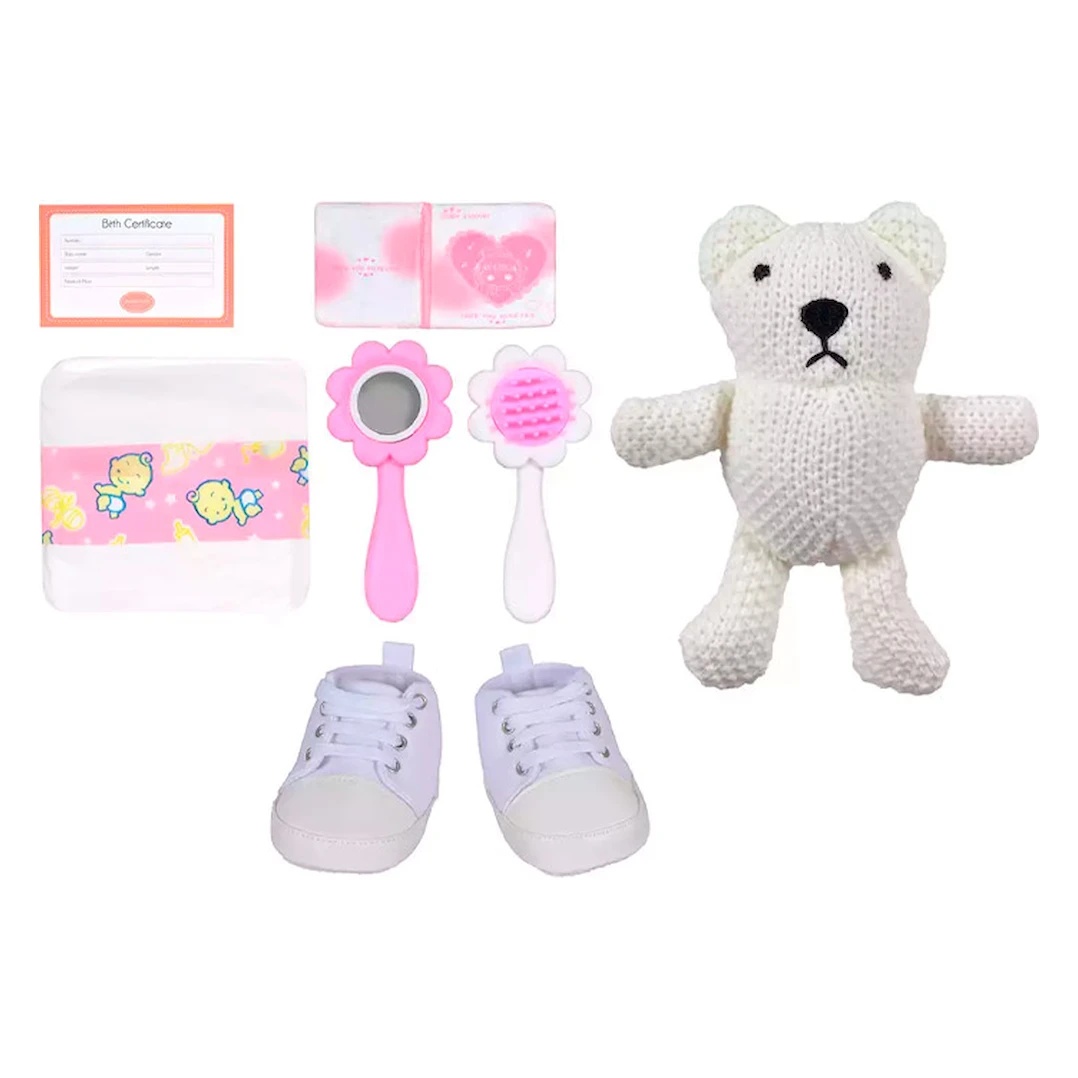 Complectatiepăpușă, set de haine, pantofiori, perie, oglindă, ursuleț