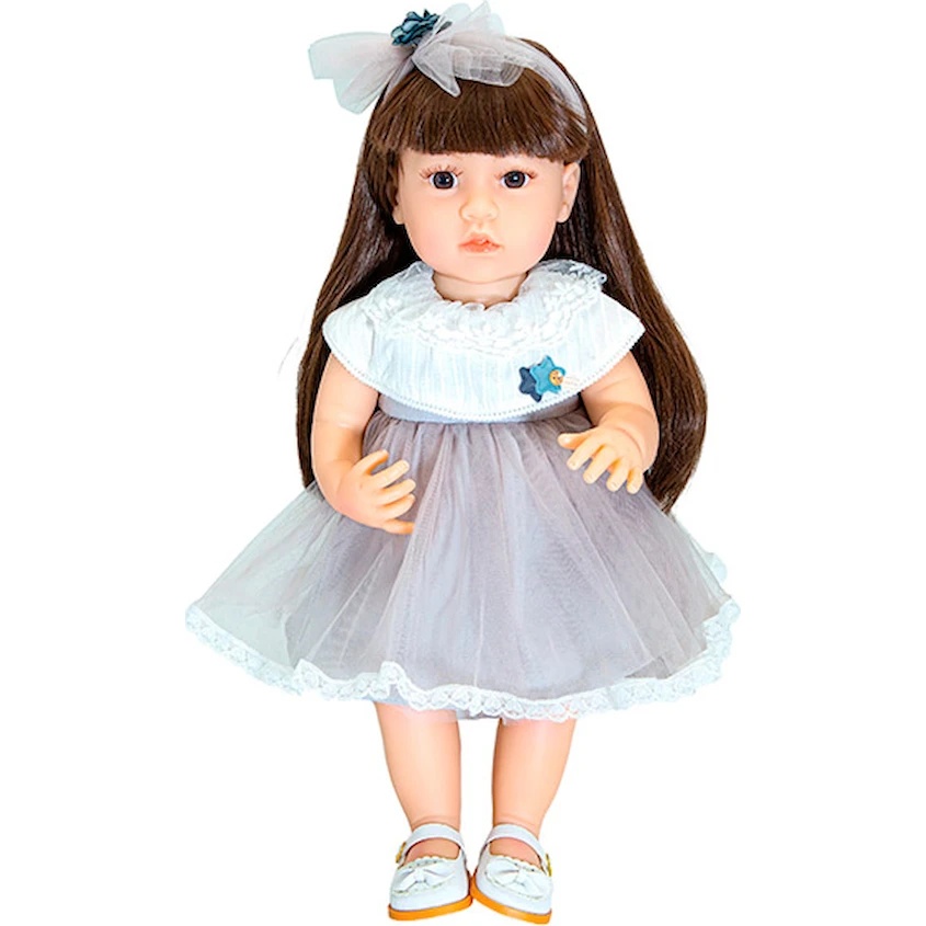 Această păpușă fermecătoare de 55 cm arată ca o mică prințesă adevărată. Are păr lung, mătăsos, de culoare castanie, cu breton delicat și ochi albaștri blânzi, plini de căldură. Pe cap poartă o fundiță fină, care îi oferă un farmec aparte. Rochița elegantă, cu fustă din tulle moale într-o nuanță delicată, este decorată cu detalii adorabile. Pantofiorii ei drăguți completează perfect ținuta, făcând din această păpușă o prietenă ideală pentru joacă, îmbrățișări și povești magice.