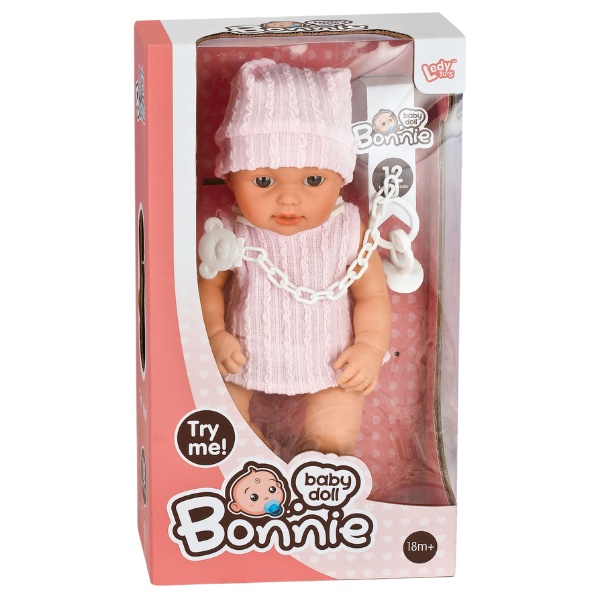 Păpușa Bonnie în costumaș tricotat roz cu căciuliță este un cadou minunat pentru copiii de la 18 luni. Păpușa are un corp moale, trăsături realiste și este realizată din materiale sigure. Setul include o suzetă cu clemă. Este ideală pentru jocuri de rol, ajutând la dezvoltarea empatiei, imaginației și gândirii emoționale.