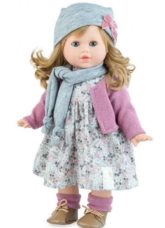 Păpușa spaniolă 626, de 42 cm, îmbrăcată elegant, este o frumoasă blondă din populara serie Tina pentru fete. Este o jucărie de vis pentru copiii de 3 ani și peste cărora le place să se îmbrace, să se legene, să se îmbrace și să se pieptene. Tina are o burtică moale, iar capul și membrele sunt fabricate din vinil neted, ușor, pictat manual. Pleoapele i se închid când se întinde. Capul rotativ facilitează crearea de noi coafuri. Aflați mai multe despre păpușa spaniolă Marina & Pau 626! Perfectă pentru jocul de rol al unei îngrijitoare grijulii, păpușa spaniolă Tina încântă cu părul blond des, moale, ușor creț și ochii albaștri pictați manual, cu o cunună de gene și sprâncene delicat definite. O gură strălucitoare și obrajii trandafirii îi conferă feței o expresie veselă. Designul unic, cusut manual, atrage și el atenția: o rochie evazată din bumbac de înaltă calitate, cu un model delicat, discret, un pulover tricotat violet deschis, pantaloni scurți albi cu manșete elastice, șosete mov și pantofi maro cu șireturi, o eșarfă gri și o șapcă decorativă completează aspectul. Alege frumoasa păpușă spaniolă 626 de înaltă calitate din colecția Marina & Pau!