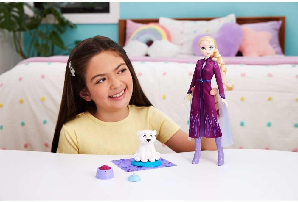 Frumoasa regină a gheții este îmbrăcată într-o ținută distinctivă de iarnă. Setul include, de asemenea, un urs polar drăguț și accesorii tematice care vă permit să vă jucați de-a îngrijirea animalelor de companie. Există o pătură, o perie, un pat și un bol special care își schimbă conținutul. Pur și simplu rotiți-l pentru a transforma mâncarea în apă! Acest lucru face joaca și mai interesantă! Părul lung al păpușii îi va încânta pe micuții coafori cărora le place să pieptăne șuvițe voluminoase și să creeze coafuri noi. Acest set este o alegere excelentă pentru toți fanii Frozen care iubesc natura, animalele și moda.