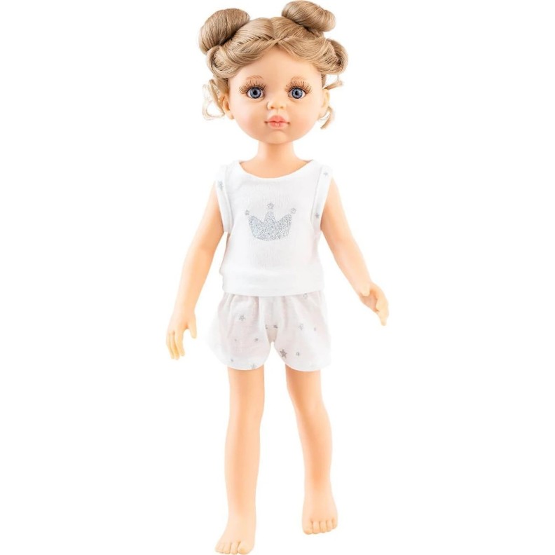 Valeria este o fetiță delicată în pijama, pregătită de somn. Are trăsături realiste, păr frumos și dimensiune de 32 cm — perfectă pentru joacă și povești liniștite de seară.